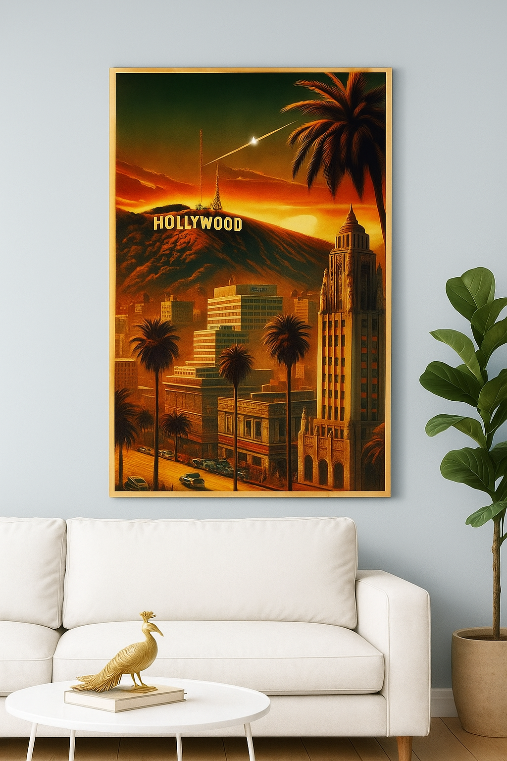 Illustrazione retrò di Hollywood con le palme e il celebre cartello, immersa nei toni caldi del tramonto. Un’icona del cinema e del sogno americano per amanti del design vintage.