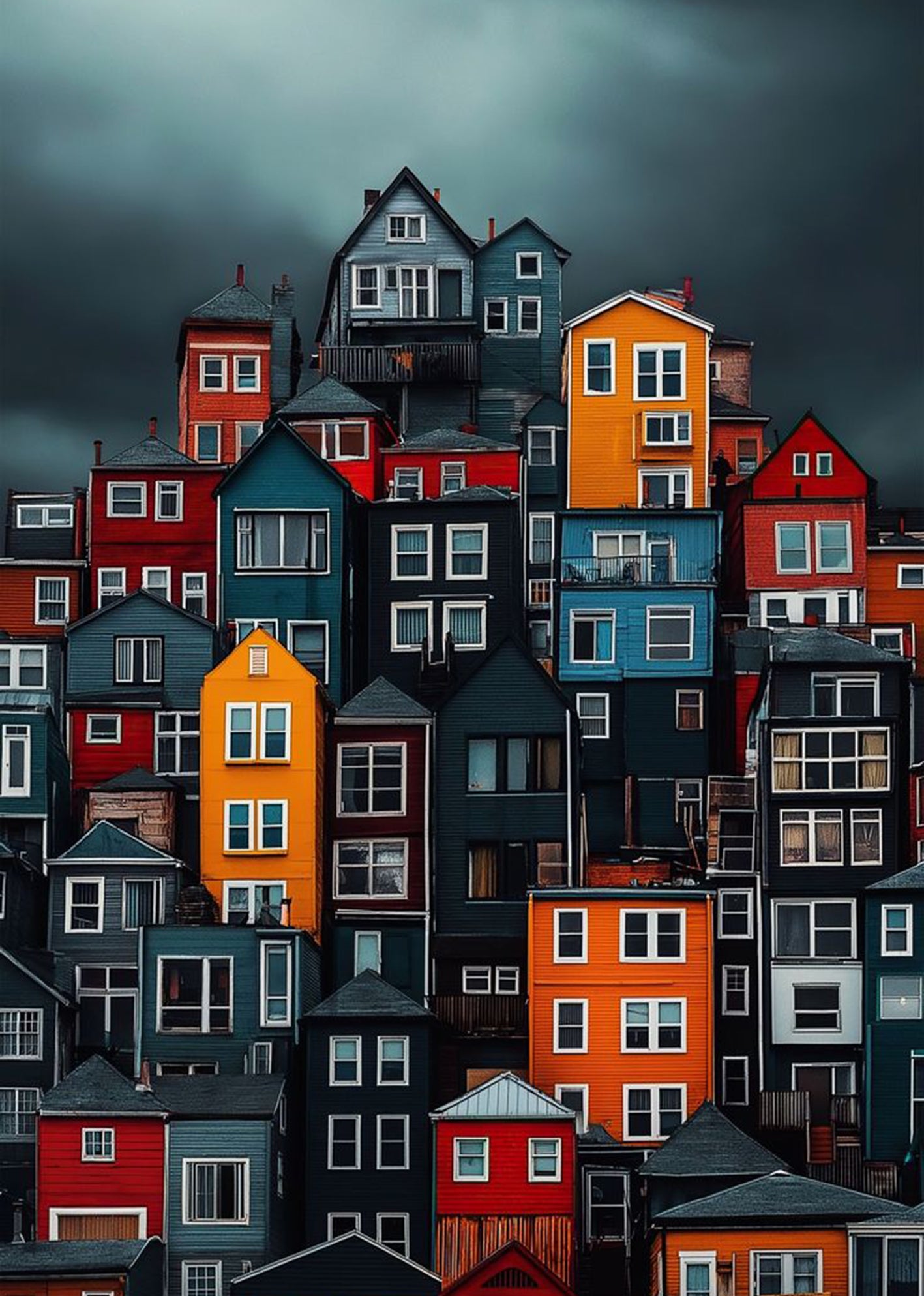 Questa stampa raffigura una fitta composizione di case colorate, impilate come in un puzzle urbano. Le tonalità accese e il cielo tempestoso creano contrasto e profondità. Perfetta per chi ama design moderno, architettura e arredi vibranti.