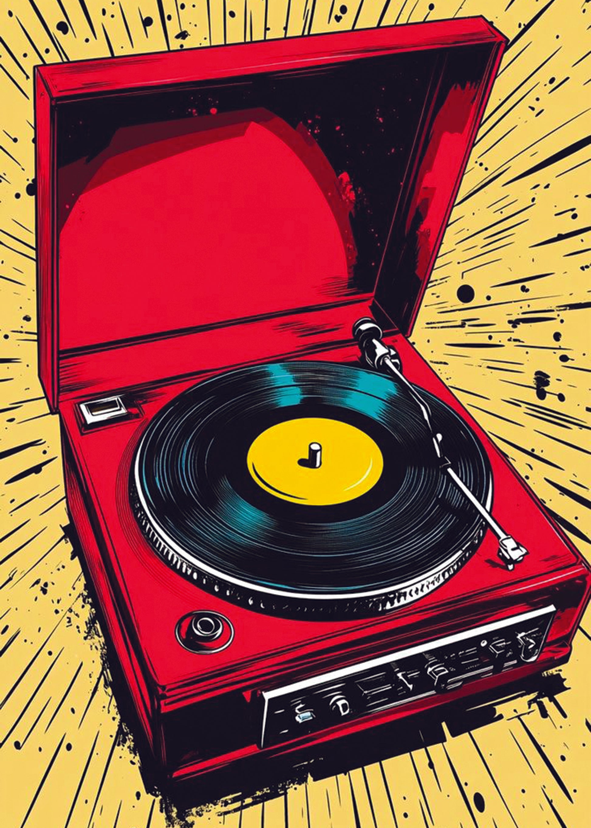 Un giradischi rosso brillante in stile pop art su sfondo giallo esplosivo. Perfetto per amanti della musica, del vinile e dell’estetica retrò anni ’70.