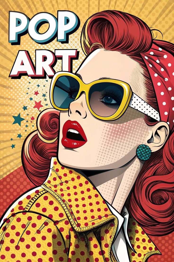 Questa energica stampa in stile Pop Art raffigura una ragazza con occhiali gialli oversize, capelli rossi ondulati e labbra rosso brillante. Il fondo a pois, le stelle colorate e la grafica esplosiva richiamano l’estetica dei fumetti americani degli anni ’60, con rimandi a Roy Lichtenstein e alla cultura visiva della pubblicità vintage. I colori saturi, le linee marcate e l’uso del retino tipografico donano dinamismo e carattere. Il look glamour della protagonista trasmette ironia, stile e un pizzico di atteggiamento pop, perfetto per ambienti giovani e creativi. Un poster ideale per camere moderne, studi artistici, negozi di moda e spazi dal mood retro-pop.